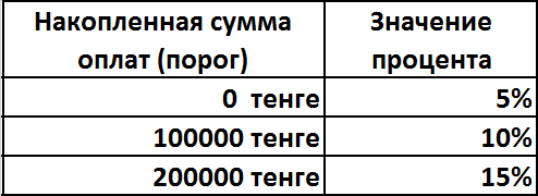 В случае если накопления оплат превысят 200 000 тг., то процент бонусов увеличится до 15%.