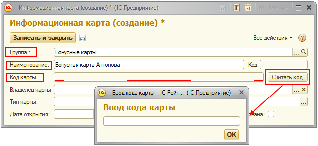 Добавим новый элемент справочника для регистрации бонусной карты посетителя Антонов И.Р. Для карты заполним следующие реквизиты: