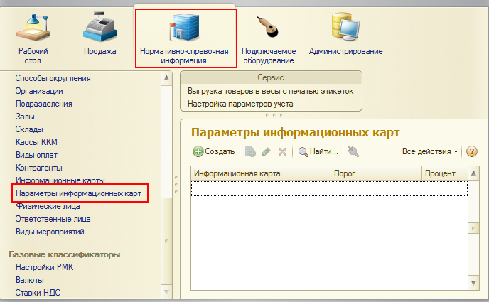 После создания бонусной карты необходимо настроить порядок накопления бонусов, согласно таблице приведенной в начале статьи. Для настройки порядка накопления бонусов, на закладке «Нормативно – справочная информация» панели навигации, переходим в регистр сведений «Параметры информационных карт».