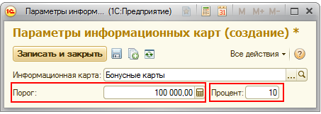 В данном регистре сведений устанавливаем порог суммы и процент бонусов для информационных (бонусных) карт. В регистр сведений «Параметры информационных карт» необходимо добавить для каждого порога отдельную строку, в которой нужно заполнить следующие реквизиты: