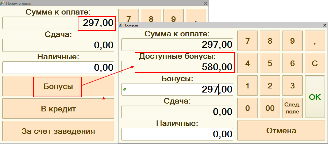 Так как наш клиент Антонов И.Р. воспользовался бонусной картой, то после её идентификации стал доступен вид оплаты «Бонусы». При выборе данного вида оплат, по нажатию соответствующей кнопки, откроется форма оплаты бонусами, где будут показаны: сумма к оплате 297 тг., доступные бонусы - 580 тг. и, также, поля для ввода суммы оплаты по выбору: либо бонусами, либо наличными. При нехватке бонусов считается, что оставшаяся сумма оплачивается наличными. В нашем случае доступных бонусов достаточно для оплаты данного заказа, и клиент оплатил заказ бонусами.