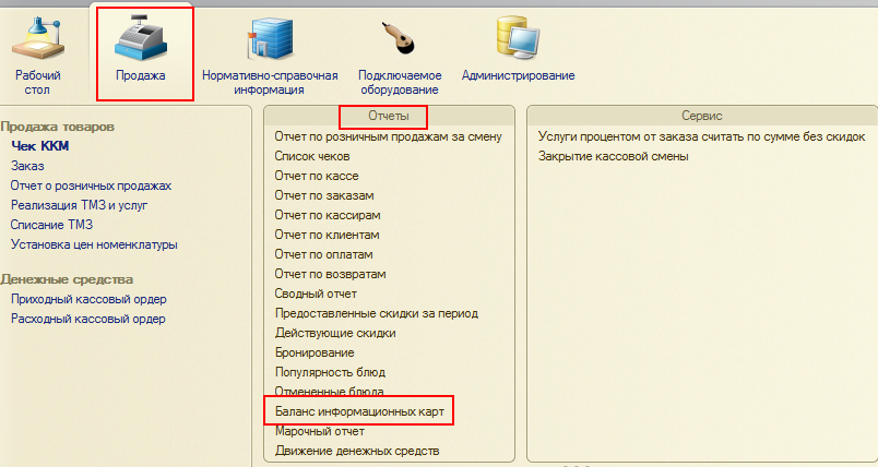 В том случае, если клиент пожелает узнать сумму своих накопленных бонусов заранее (до заказа), то для получения такой информации предусмотрен отчет «Баланс информационных карт», который расположен в группе «Отчеты» закладки «Продажа».