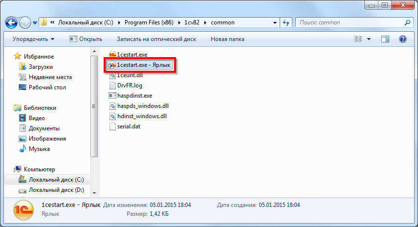 В результате выполнения этого действия в каталоге появится новый файл с именем «1cestart.exe - Ярлык».