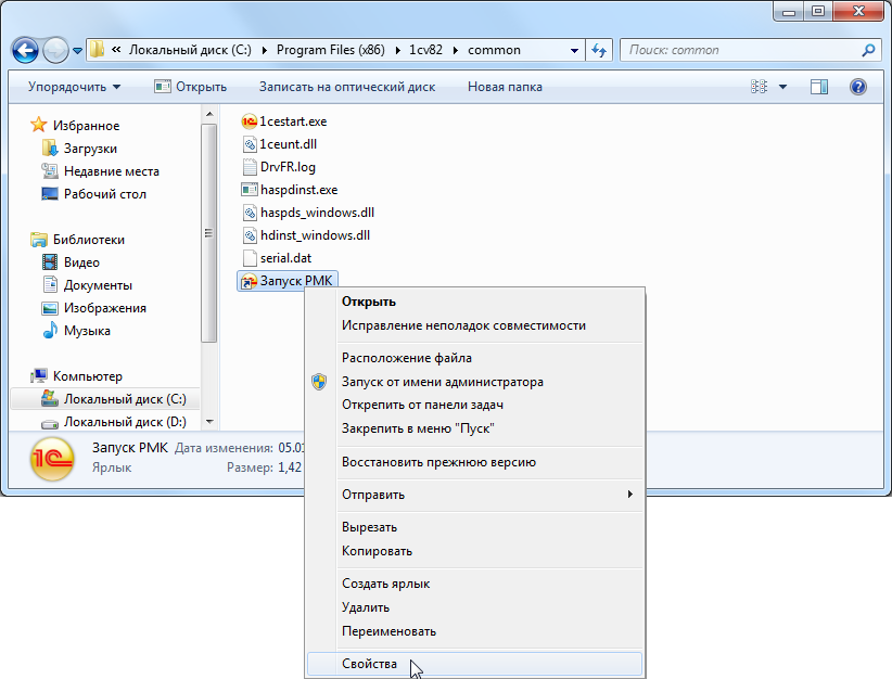 В рассматриваемом нами примере операционная система 64-битная, поэтому файл «1cestart.exe» должен располагаться в каталоге «C:\Program Files (x86)\1cv82\common\».