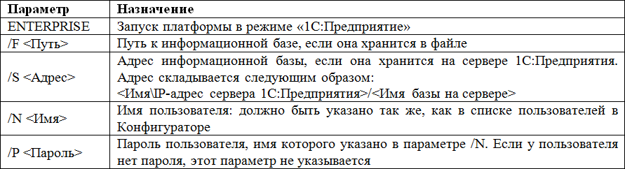 Для настройки запуска информационной базы в режиме «1С:Предприятия» под определенным пользователем нам потребуются следующие параметры: