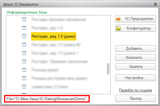 Следующий параметр зависит от того, в каком варианте работает наша демонстрационная база: файловом или клиент-серверном. Чтобы это выяснить - запустим 1С:Предприятие и в окне выбора баз выделим нашу демонстрационную базу «Ресторан, ред.1.0 (демо)». В нижней части формы при этом отобразится путь к информационной базе.