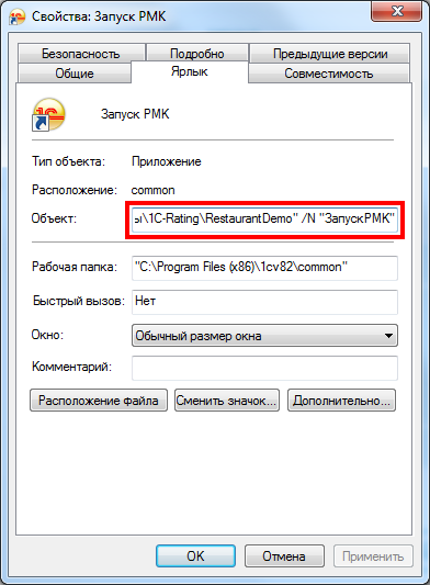 «C:\Program Files (x86)\1cv82\common\1cestart.exe» ENTERPRISE /F «D:\Мои базы\1C-Rating\RestaurantDemo» /N «ЗапускРМК»