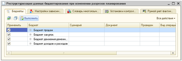 Это действие необходимо для корректной работы механизмов бюджетирования в дальнейшем. Данную обработку обязательно следует запускать каждый раз после того, как в финансовых показателях начинает использоваться вновь добавленный разрез бюджетирования.