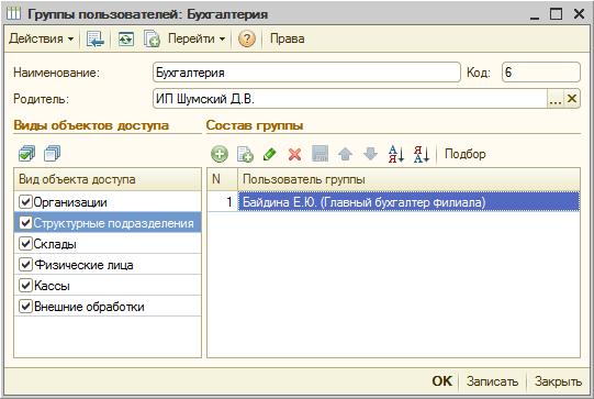 В поле «Виды объектов доступа» формы элемента справочника Группы пользователей (как видно на предыдущем скриншоте) приведен список справочников, к элементам которых будут применяться ограничения прав на уровне записей. Путем установки/снятия флажков можно включать/отключать контроль прав. Например, если для группы установлен флажок для строки «Организации», то будут применяться ограничения на отдельные элементы данного справочника и на документы с их участием. Если этот флажок снят, то пользователи данной группы будут видеть все элементы справочника и все документы с их участием.