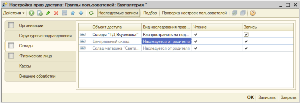Настройка непосредственно прав доступа к отдельным элементам производится из справочника «Группы пользователей» при помощи обработки настройки прав доступа.