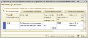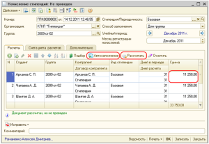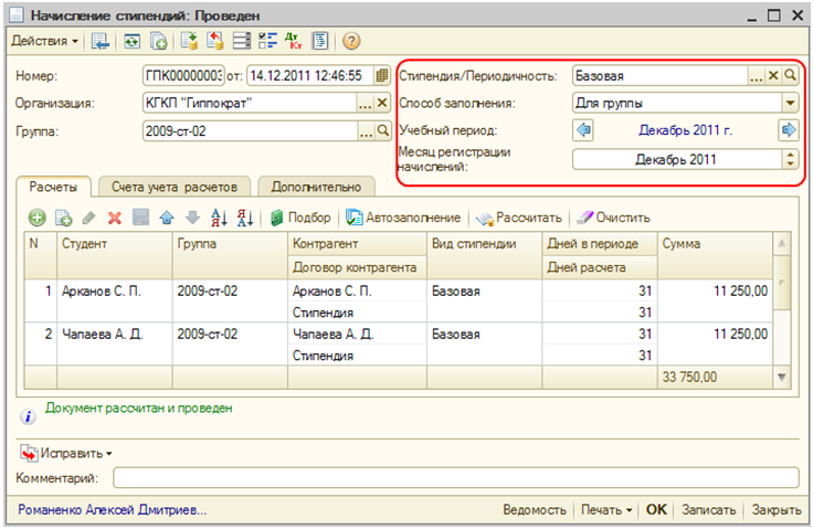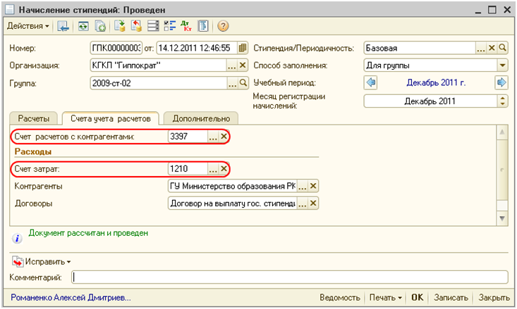 При отражении документа в бухгалтерском учете, регистрируется кредиторская задолженность перед контрагентами на счете, указанном в поле Счет расчетов с контрагентами (по кредиту проводки), в корреспонденции со счетом и аналитикой, указанными в группе Расходы (по дебету проводки), на сумму рассчитанной стипендии. В оперативном учете при проведении документа отражаются суммы к оплате в разрезе видов стипендий и учебных периодов.