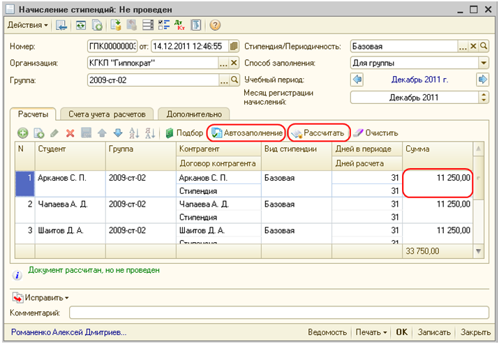 После заполнения всех вышеперечисленных параметров, можно выполнить автозаполнение документа (по кнопке «Автозаполнение»). Документ будет заполнен студентами, удовлетворяющими условиям отбора, и которым еще не были произведены начисления данного вида стипендии в указанном учебном периоде. Помимо этого, будет заполнено количество дней в периоде, определяемое по учебному периоду документа (для месяца это количество дней в месяце, для недели 7 дней и т. д.) и количество дней расчета, означающее количество дней, за которое студенту должна быть начислена стипендия. Значение вычисляется с учетом даты назначения/отмены стипендии и изменения статуса студента в течение месяца. Далее, при нажатии на кнопку «Рассчитать», будут рассчитаны суммы стипендий.