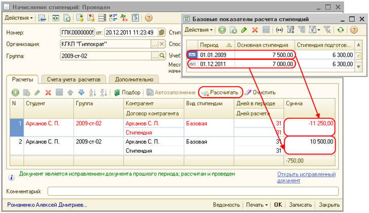 В табличной части «Расчеты» документа-исправления формируются сторно-строки и новые строки начисления. Сформированные автоматически сторно-строки нельзя редактировать. Новые строки начисления формируются по актуальным данным: по тарифам, приказам по учебному заведению. Для расчета сумм в этих строках необходимо нажать кнопку «Рассчитать», суммы в сторно-строках при этом не пересчитываются.