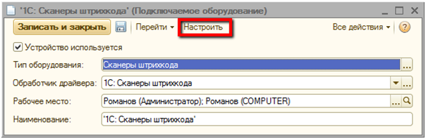 После этого необходимо сохранить указанные настройки и установленное оборудование в информационной базе при помощи кнопки «Записать и закрыть». На этом настройка сканера штрих-кодов окончена.