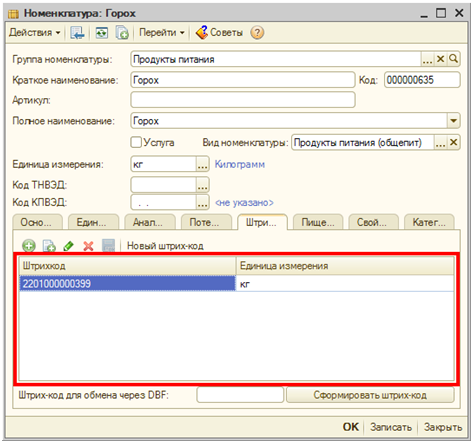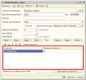 Затем внести в табличную часть «Штрих-код» справочника «Номенклатура» соответствующий штрих-код.