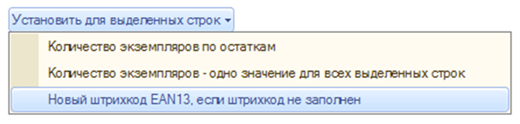 Для номенклатуры, у которой нет штрих-кода, необходимо сгенерировать его. Для этого необходимо выделить строки с незаполненными штрих-кодами и воспользоваться меню «Установить для выделенных строк» — «Новый штрих-код EAN13, если штрих-код не заполнен».