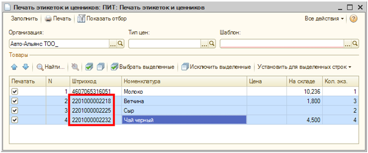 Теперь необходимо распечатать этикетки со сгенерированными штрих-кодами. Строкам с номенклатурой, для которой были сгенерированы штрих-коды, необходимо установить признак «Печатать». В реквизите «Шаблон» шапки обработки необходимо выбрать созданный ранее шаблон «Этикетка» и нажать кнопку «Печать».