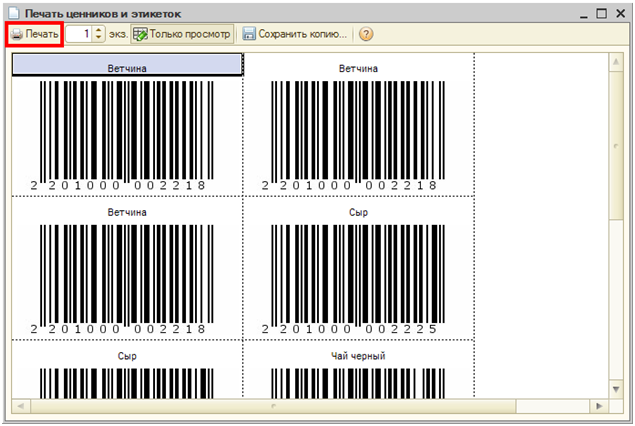 После этого будет открыта специальная обработка «Печать этикеток и ценников».