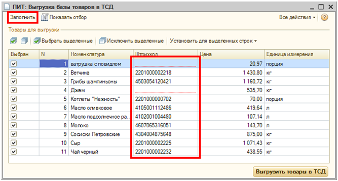 После добавления имеющихся штрих-кодов для их обновления в обработке выгрузки необходимо нажать кнопку «Заполнить».