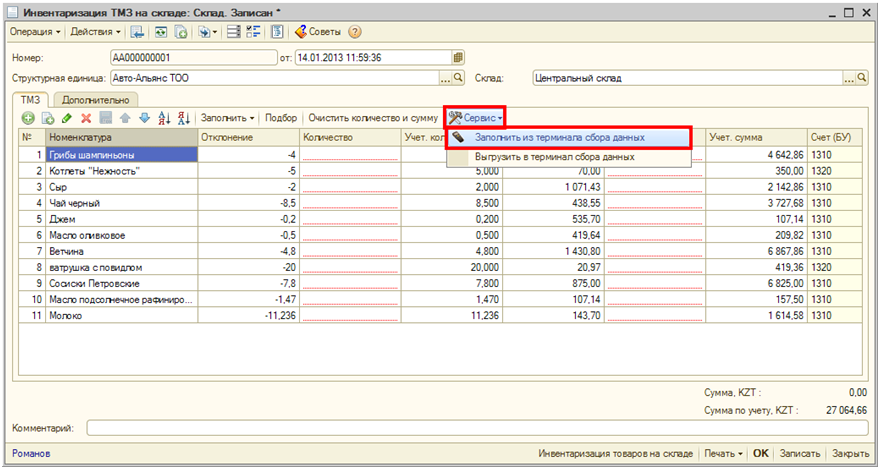 Затем необходимо подключить терминал сбора данных и выгрузить из него данные воспользовавшись меню «Сервис» — «Заполнить из терминала сбора данных».