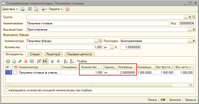 Далее для номенклатуры «Пельмени (блюдо)» необходимо создать рецептуру из расчета, что для приготовления 1 кг пельменей требуется примерно 2,5 упаковки купленных пельменей - номенклатура «Пельмени (готовые в упаковке)». Для этого в табличной части «Ингредиенты» спецификации номенклатуры в качестве ингредиента необходимо указать номенклатуру «Пельмени (готовые в упаковке)» в количестве 1 килограмма, а в колонке «Коэффициент» указать коэффициент пересчета из упаковок в килограммы равный 2,5.