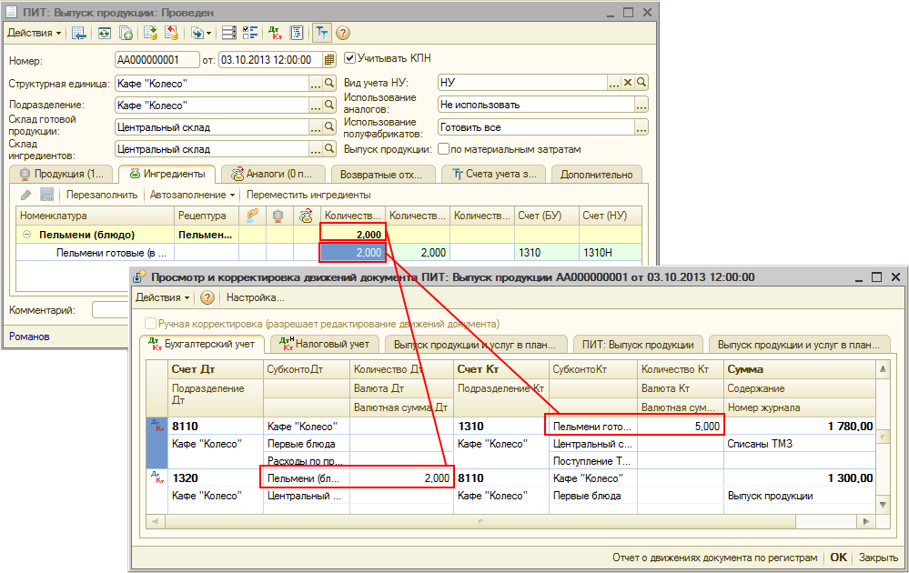 В результате выполненных настроек, документом «Выпуск продукции» будет автоматически рассчитываться выпуск готовой продукции – «Пельмени (блюдо)» и количество израсходованного полуфабриката в килограммах, а списание полуфабриката «Пельмени (готовые в пачке)» будет производиться в упаковках.