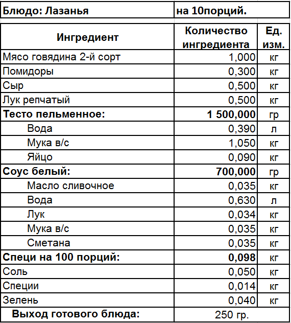 Нам необходимо создать рецептуру для блюда «Лазанья» на 10 порций, используя в рецептуре полуфабрикаты: тесто пельменное и белый соус. Кроме этого, необходимо сформировать технологическую и калькуляционную карточки.