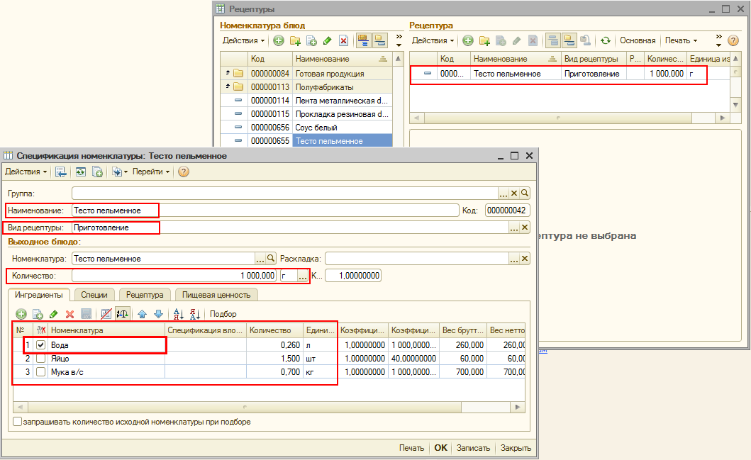 Далее в регистре сведений «Рецептуры» создаем рецептуру полуфабриката «Тесто пельменное» на 1000 грамм (по общепринятому стандарту), а при создании рецептуры блюда «Лазанья» будем использовать 1500 грамм полуфабриката. В этом случае программа автоматически рассчитает в рецептуре необходимое количество ингредиентов теста для 1500 грамм. Вносим необходимые ингредиенты: «Вода», «Мука» и «Яйцо». Ингредиент «Вода» используется при создании рецептуры, но не участвует в расчете калькуляции, поэтому, при добавлении данного ингредиента в табличную часть «Ингредиенты», необходимо установить флаг «Не списывать».