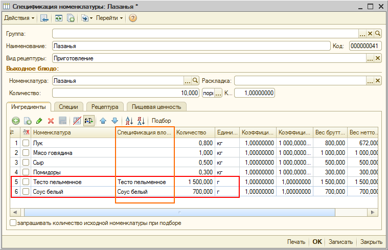 После того, как создали необходимые нам полуфабрикаты, продолжим создание рецептуры блюда «Лазанья». В табличную часть «Ингредиенты» вносим «Тесто пельменное» и «Соус белый». Кроме самих ингредиентов в табличной части в колонке «Спецификация вложенная» указываем созданные спецификации.