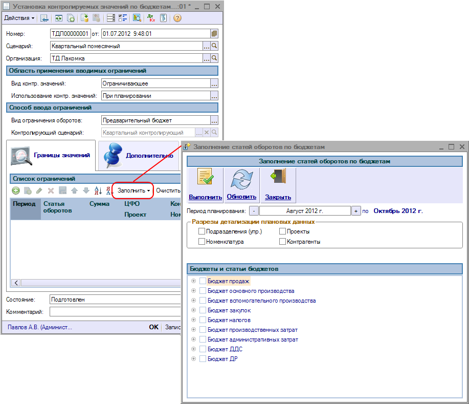 Использовать контролируемые значения можно как при планировании оборотов по статьям, так и при регистрации фактических данных в интерактивном режиме.