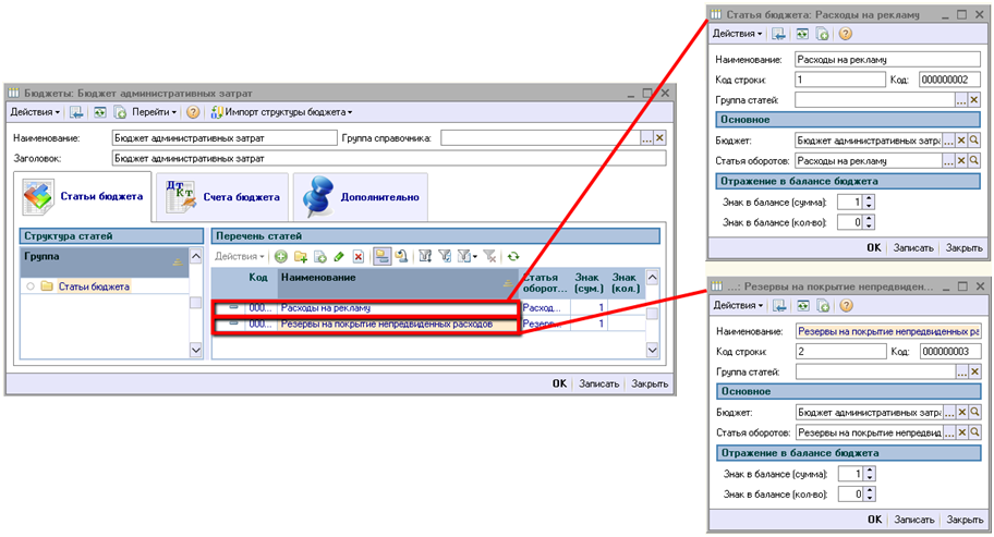 Знак в балансе (для суммы и для количества) влияет на получение итогов по группам иерархии строк бюджета – каким образом (с каким знаком) обороты по статье учитываются в обороте по группам. Например, в рассматриваемом нами случае, обороты по статьям суммируются, поэтому для всех статей реквизит «Знак в балансе (сумма)» со значением «1», то есть положительный. Однако, для группы «Расходы» бюджета доходов и расходов данный реквизит указан со значением «-1». Это означает, что обороты по этой группе будут вычитаться при формировании итогов по данному бюджету.