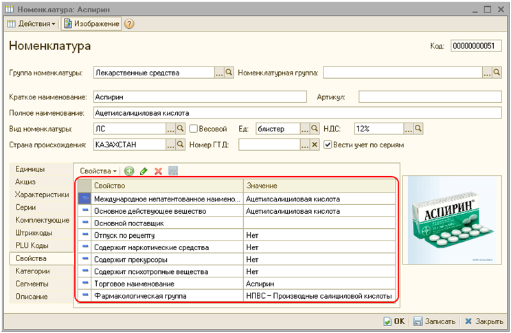 Каждый элемент справочника «Номенклатура» имеет список свойств. Свойства представляют собой расширяемый список дополнительных аналитических признаков. Свойства номенклатуры можно просмотреть на закладке «Свойства», по умолчанию данный список заполнен следующими значениями: торговое наименование, международное непатентованное наименование, фармакологическая группа, основное действующее вещество, содержит психотропные вещества, содержит прекурсоры, отпуск по рецепту, содержит наркотические вещества. Список свойств может быть расширен пользователем.