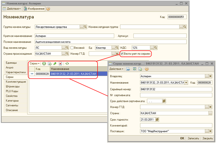 Конфигурация предоставляет возможность хранить информацию о серийном номере, номере и дате сертификата, дате выпуска, сроке годности, производителе и стране происхождения лекарственного средства, то есть вести учет по сериям.