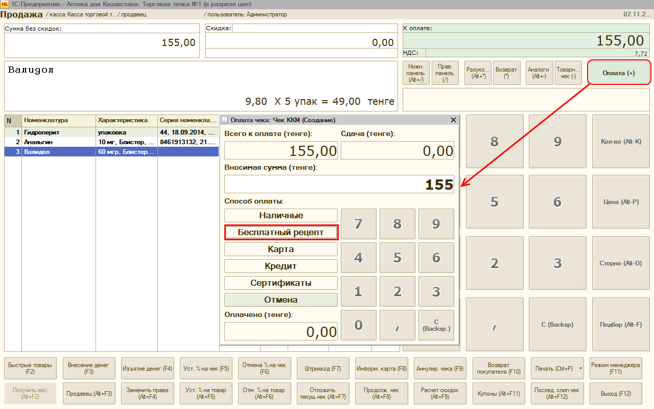 Таким образом, прикладное решение «1С:Аптека для Казахстана» позволяет фармацевту оформить отпуск лекарственного средства по бесплатному рецепту и осуществить анализ продаж с учетом различных видов оплаты.