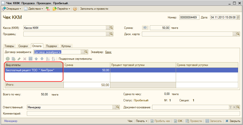 Документ «Чек ККМ», созданный по бесплатному рецепту, ничем не отличается от чека с обычной реализацией. На закладке «Оплата» табличной части документа колонка «Вид оплаты» будет заполнена видом оплаты по бесплатному рецепту.