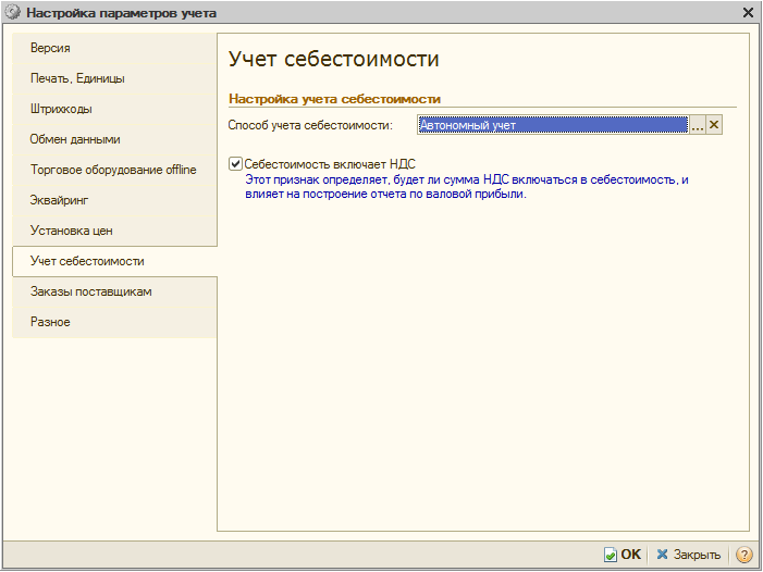 • Флаг «Себестоимость включает НДС» — если флаг установлен, то сумма НДС будет включена в себестоимость.