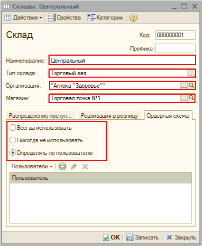• «Определять по пользователю» — поступление и реализация товаров по ордерной схеме будут иметь право осуществлять только указанные в списке пользователи.