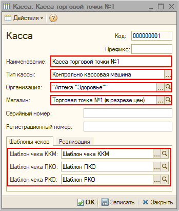 Если установлен тип кассы «Контрольно-кассовая машина», то на закладке «Шаблоны чеков» выберите шаблоны для чеков. Шаблоны чеков уже предусмотрены в конфигурации.