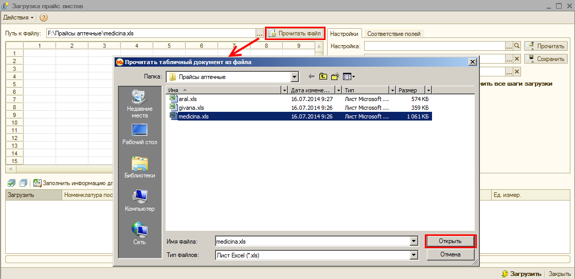 Разберем ситуацию, когда используется уже созданная ранее настройка для загрузки прайс-листов поставщиков. В поле «Путь к файлу» введите путь к файлу, содержащему прайс-лист поставщика, или выберите файл с помощью кнопки «Прочитать файл». Далее выберите соответствующую настройку для загрузки и нажмите кнопку «Прочитать». Все настройки соответствия реквизитов справочника и файла заполнятся автоматически.