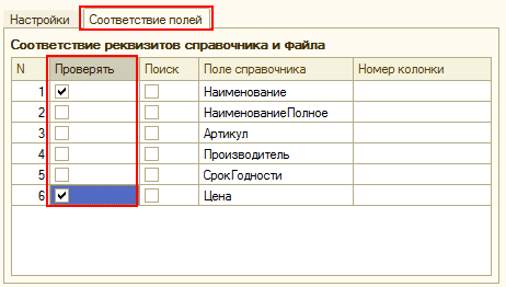 Теперь необходимо настроить соответствие полей между структурой файла прайс-листа и реквизитами справочника «Номенклатура поставщиков». Данные из прочитанного прайс-листа будут записываться в справочник «Номенклатура поставщиков». На закладке «Соответствие полей» расположена таблица, в которой выполняется настройка загрузки информации. Таблица состоит из следующих колонок: «№», «Проверять», «Поиск», «Поле справочника» и «Номер колонки».
