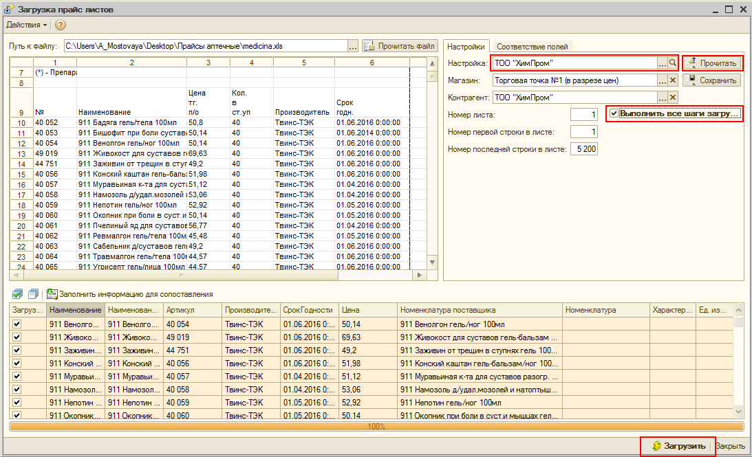 Если структура загружаемого файла прайс-листа поставщика не изменилась, то установите флаг «Выполнить все шаги загрузки» и нажмите кнопку «Загрузить». Все операции по сопоставлению данных из файла с данными из информационной базы выполнятся автоматически.