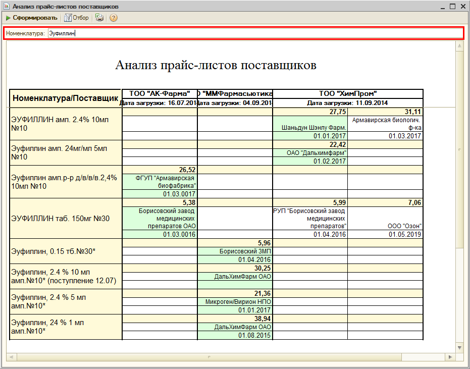 Система сравнит цены каждой номенклатуры по поставщикам, производителям и срокам годности. Ячейка с минимальной ценой будет подкрашена зеленым цветом.