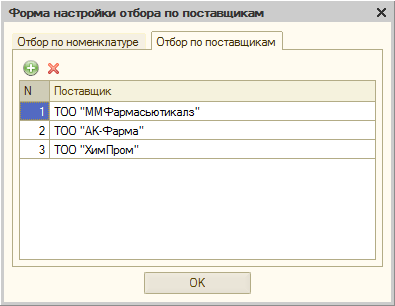 Чтобы установить отбор по поставщикам, перейдите в форму настройки отбора с помощью кнопки «Отбор». В форме отбора на закладке «Отбор по поставщикам» укажите поставщиков, по которым необходимо выполнить отбор.