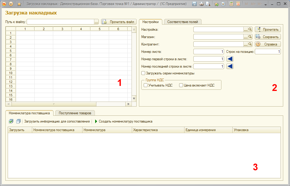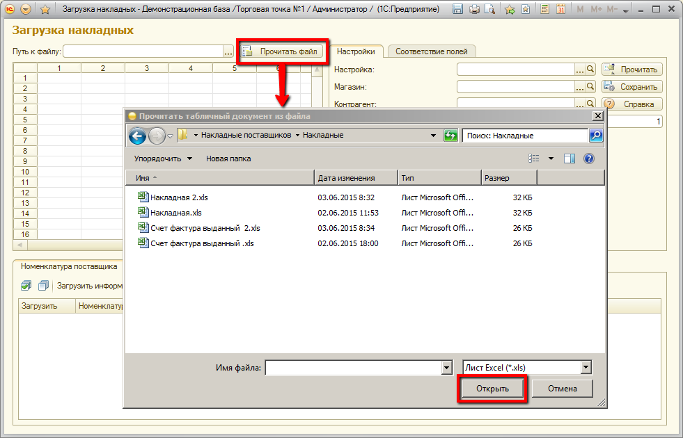 Рассмотрим порядок работы с обработкой «Загрузка накладных». Для начала разберем создание новой настройки загрузки. В первую очередь в обработку необходимо добавить файл с накладной в форматах *.xls или *.xlsx. Для этого в рабочей области загрузки информации из накладной (область «1») необходимо воспользоваться кнопкой «Прочитать файл», по нажатию которой появится диалоговое окно, где необходимо выбрать нужный файл и нажать кнопку «Открыть».