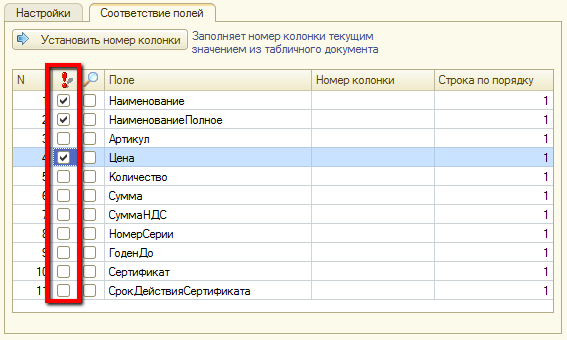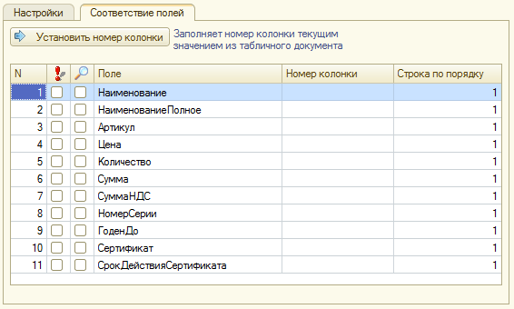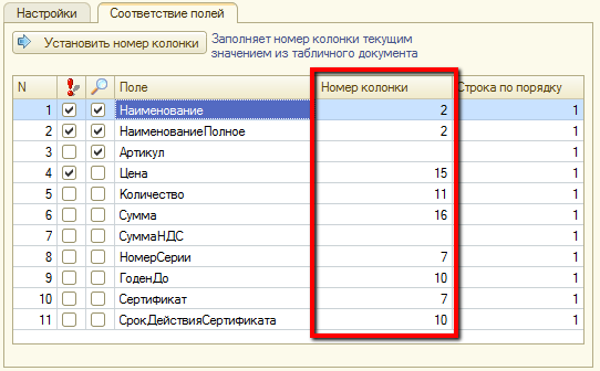 Теперь необходимо указать номер колонки из загружаемой накладной, в которой содержатся значения для загрузки в информационную базу. Например, для поля «Наименование» и «Наименование полное» укажите номер колонки, в которой содержится название лекарственного средства, в поле «Цена» — номер колонки, содержащей цену лекарственного средства и так далее. Если накладная не содержит информации, представленной в списке соответствия полей, например, поставляется без артикула, то колонка «Номер колонки» для поля «Артикул» не заполняется и остается пустой. Для определения номера поля удобно использовать кнопку «Установить номер колонки», при нажатии которой значение колонки «Номер колонки» заполнится номером того столбца, на котором в данный момент установлен курсор в табличном документе.