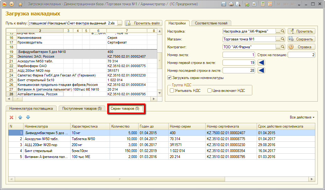 Так как в настройке загрузки установлен флаг «Загружать серии номенклатуры», то на закладке «Серии товаров» дополнительно будет загружена информация и по сериям номенклатуры. В процессе загрузки осуществляется поиск по уже имеющимся сериям номенклатуры: номер серии, срок годности, номер сертификата, срок действия сертификата. Если в базе отсутствует информация по данным сериям — будут создаваться новые элементы справочника «Серии номенклатуры», иначе — серии будут получены из информационной базы.