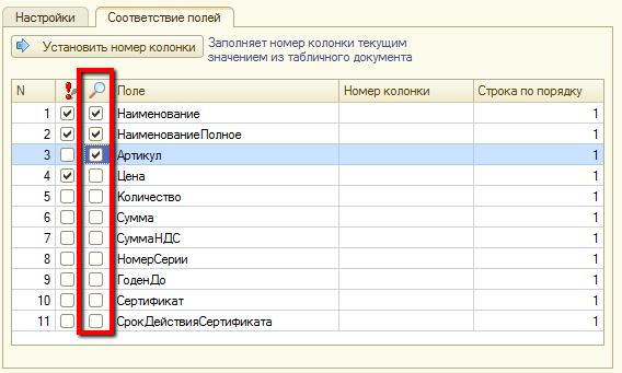 Далее необходимо определить поля, по которым выполнится поиск и сопоставление информации из загружаемой накладной с информацией из базы данных. В качестве полей для поиска можно определить поля «Артикул» или «Наименование».