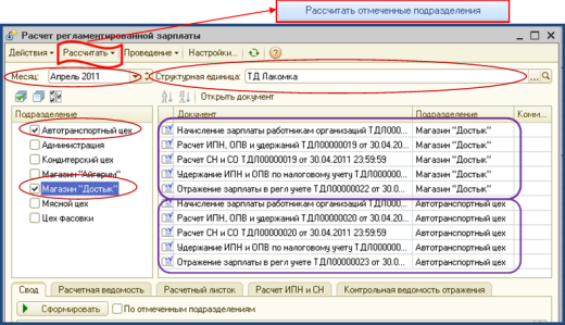 После установленных настроек нажимаем кнопку «Рассчитать отмеченные подразделения» через меню «Рассчитать». Таким образом, одним нажатием кнопки сформируются и рассчитаются все указанные виды документов.