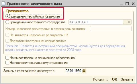 Для расчета сумм индивидуального подоходного налога, расчета обязательных пенсионных взносов, суммы социальных отчислений с доходов работника необходимо в карточке физического лица (меню Кадровый учет - Физические лица) в графе «Гражданство» установить признак «Гражданин Республики Казахстан». Признаки «Не имеет право на пенсионное обеспечение», «Не подлежит социальному страхованию» НЕ устанавливаются (!).