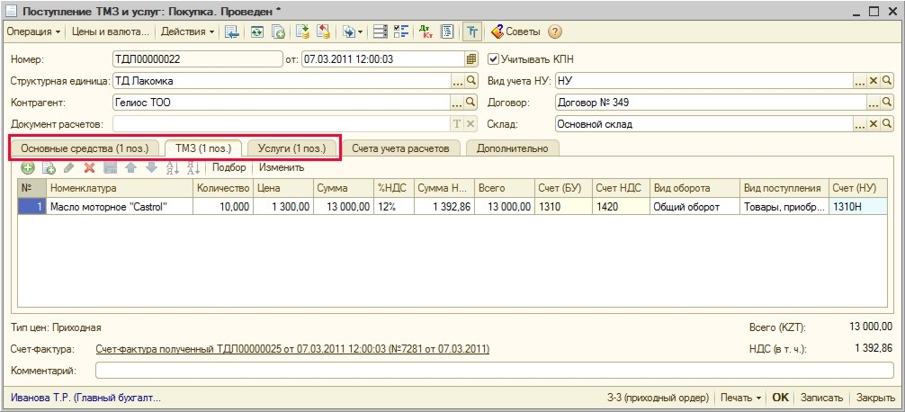Важно! Для отражения поступления ТМЗ, услуг и ОС предназначен один документ.